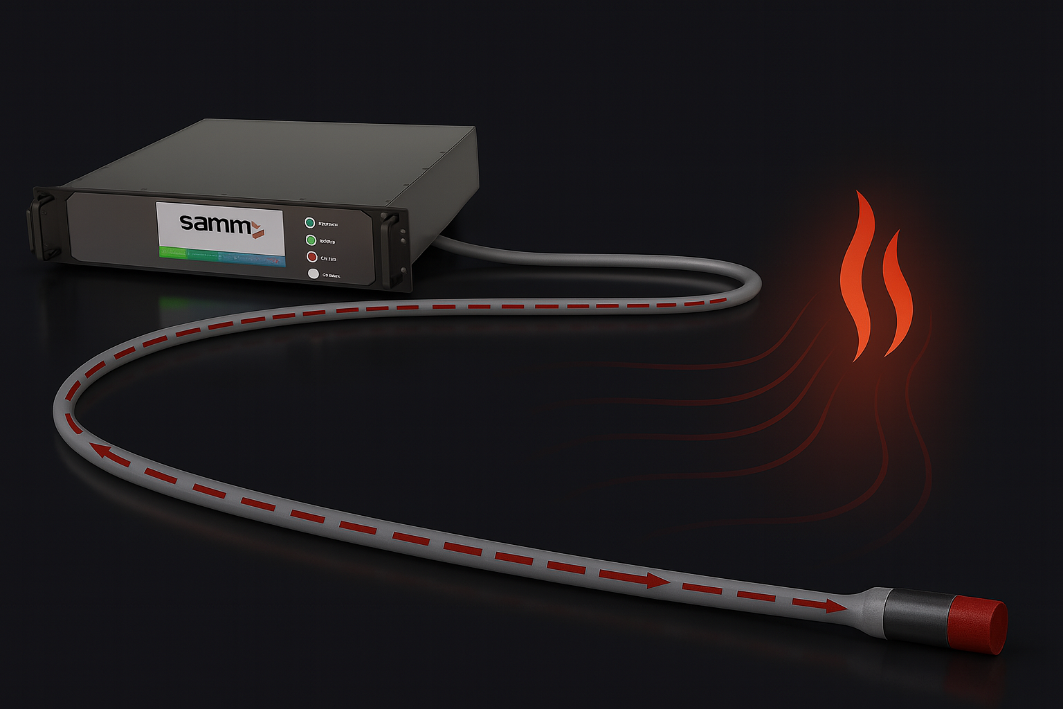 Temperature is continuously measured along the fiber. The system evaluates every point of the cable as a virtual sensor, generating a seamless thermal map.